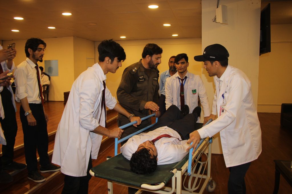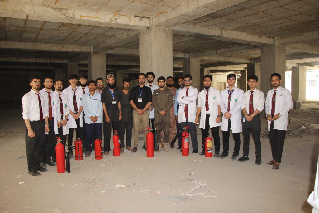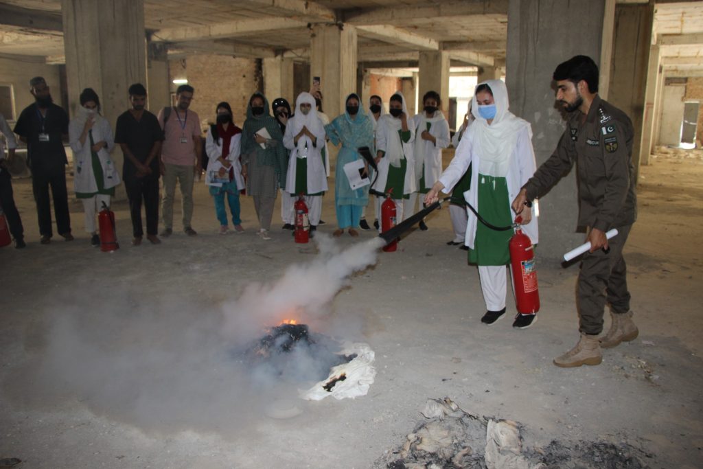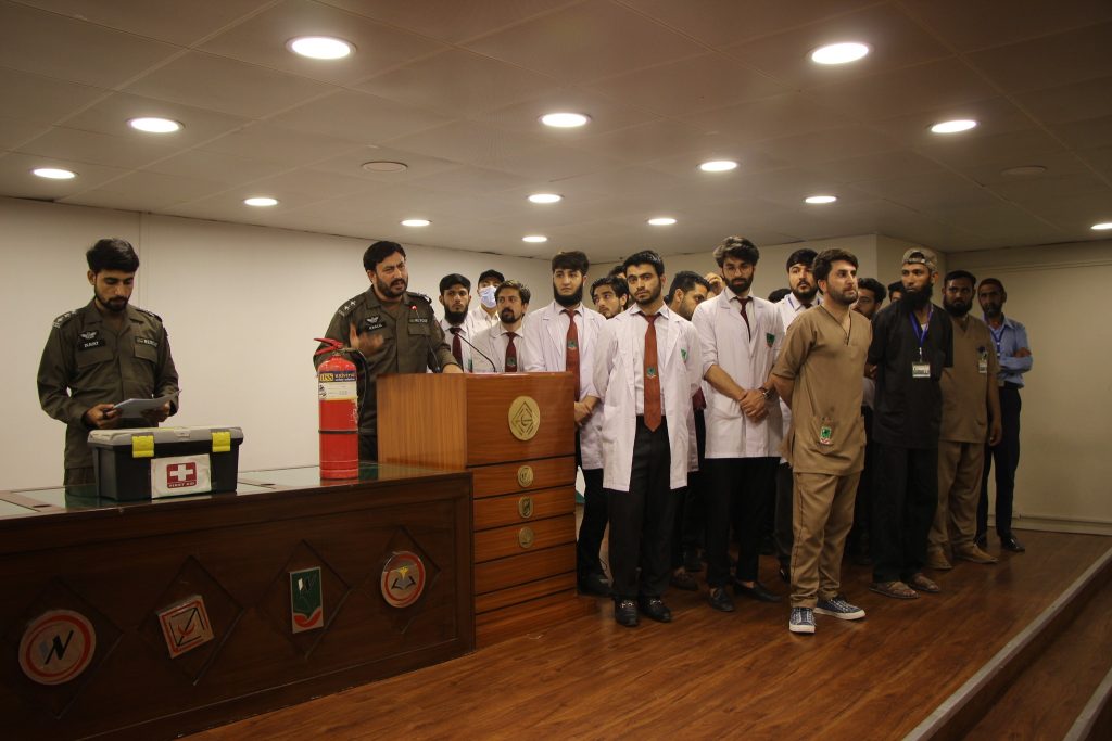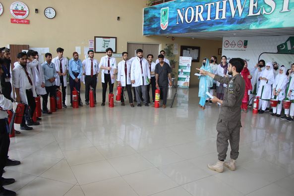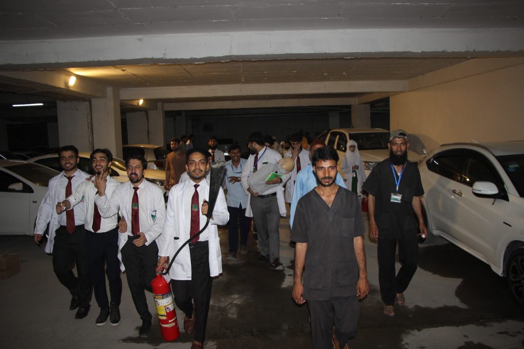 A mock major disaster drill was arranged by the Department of Occupational Health, Safety and Environment (OHS&E) in collaboration with Rescue 1122 at the Northwest School of Medicine (NWSM) on 21 June 2023. A Large number of Students, Faculty and Non-Faculty staff, and Demonstrators participated in the session. Lab The Rescue 1122 representatives Mr. Inayat Ur Rehman, medical safety instructor and Mr. Khalil Ur Rehman, fire and safety instructor, trained the participants on first aid provision, emergency evacuation and fire safety. The mock drill also helped identify the limitations of the current emergency preparedness plan. Realistic emergency preparedness drills and exercises can help ensure a more effective response when disaster strikes. Studying lessons learned from other emergencies and practicing simulations is the best alternative to real-world experience because the ability to equivocally learn in a replicated environment strengthens readiness to respond during a disaster.