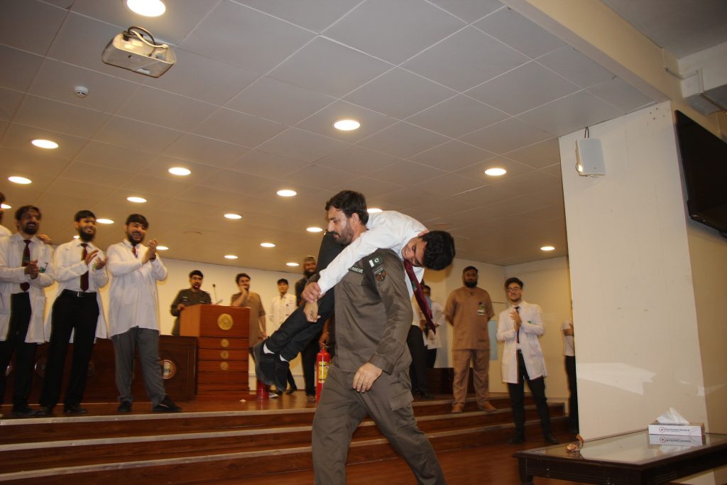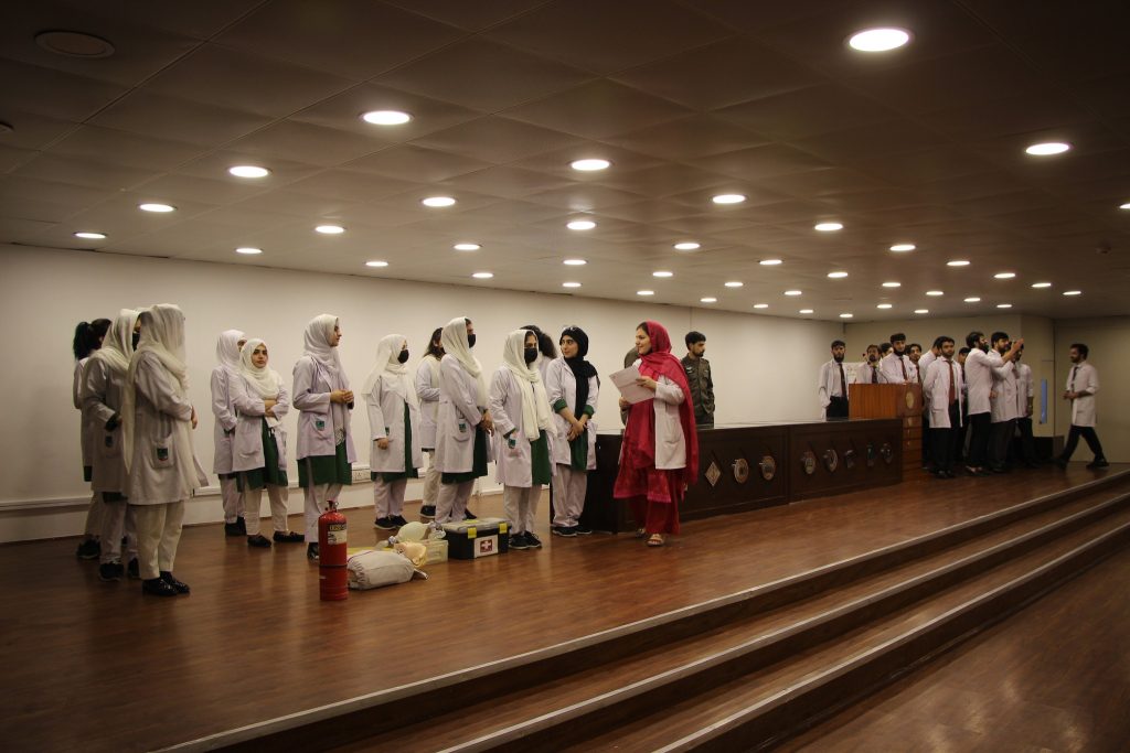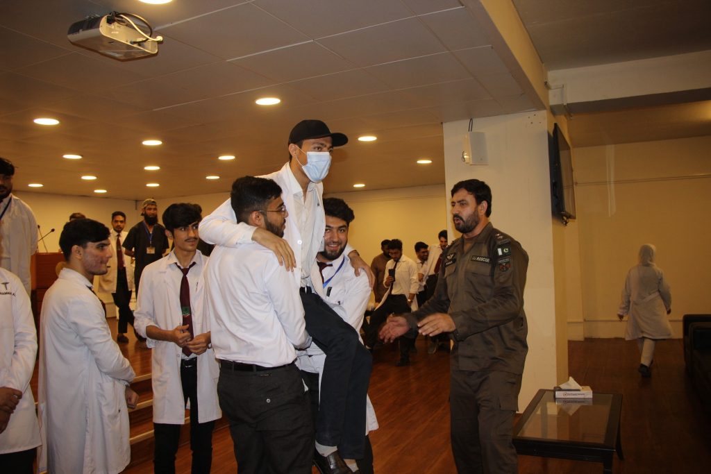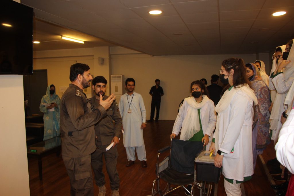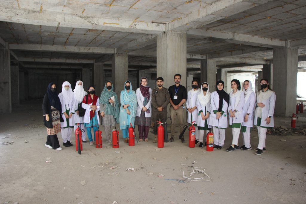 A mock major disaster drill was arranged by the Department of Occupational Health, Safety and Environment (OHS&E) in collaboration with Rescue 1122 at the Northwest School of Medicine (NWSM) on 21 June 2023. A Large number of Students, Faculty and Non-Faculty staff, and Demonstrators participated in the session. Lab The Rescue 1122 representatives Mr. Inayat Ur Rehman, medical safety instructor and Mr. Khalil Ur Rehman, fire and safety instructor, trained the participants on first aid provision, emergency evacuation and fire safety. The mock drill also helped identify the limitations of the current emergency preparedness plan. Realistic emergency preparedness drills and exercises can help ensure a more effective response when disaster strikes. Studying lessons learned from other emergencies and practicing simulations is the best alternative to real-world experience because the ability to equivocally learn in a replicated environment strengthens readiness to respond during a disaster.