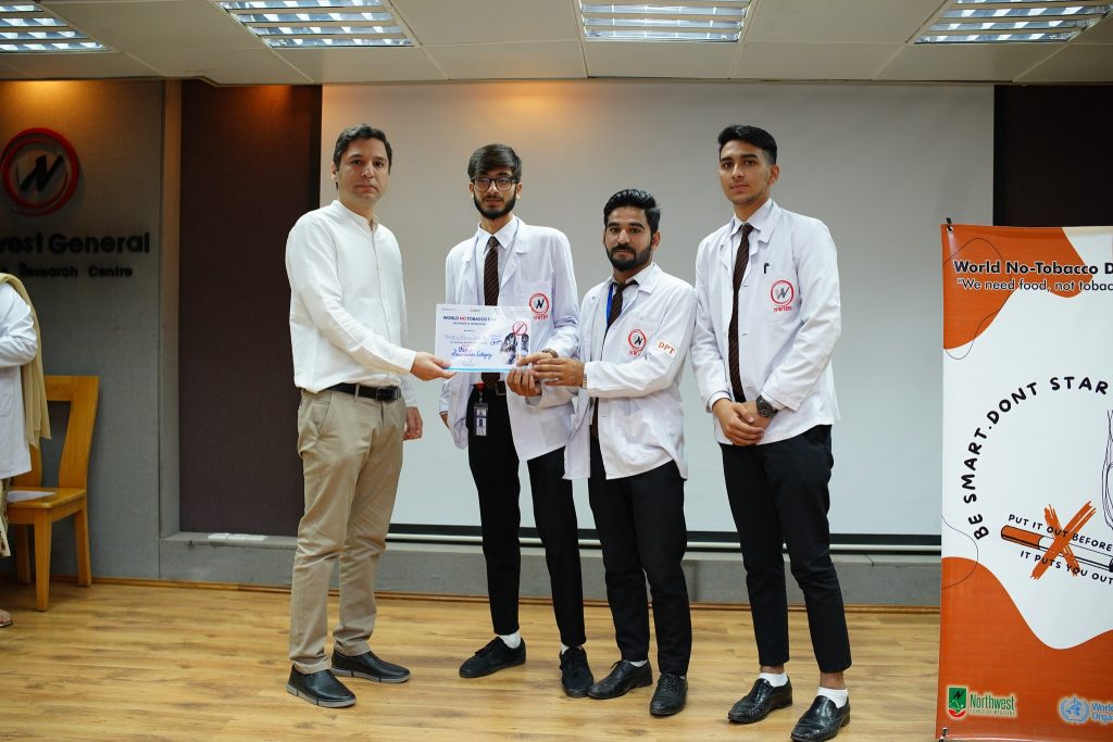 Northwest observed World No Tobacco Day by organising an event on the 31st May 2023 at the 4th-floor auditorium, NWGH. The event was dedicated to raising awareness regarding the harmful effects of tobacco and promoting a smoke-free environment. Dr. Zia ur Rehman, CEO NWGH, Prof. Dr. Noor-ul-Iman, Principal NWSM, and Ms. Syeda Zainab Naqvi, Assistant Commissioner were present at the event.