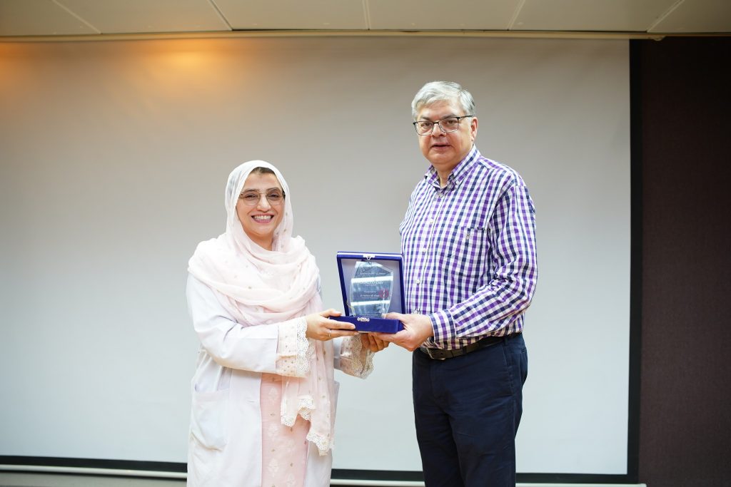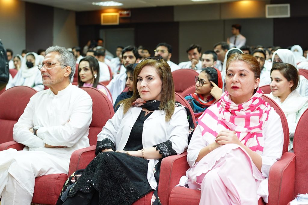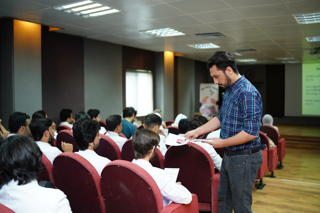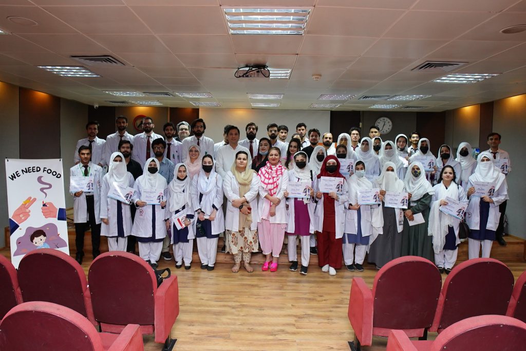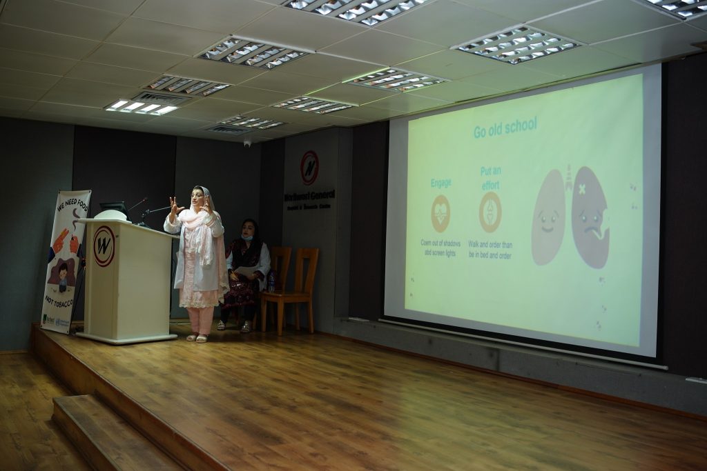 The programme commenced with a welcome address by Dr. Nadia Qazi, Assistant Professor, Department of Community Medicine followed by the recitation of the Holy Quran. Next, Dr. Imran Mohib, Consultant ENT and Head & Neck Surgeon, NWTH took the stage and shared his insights on the intricate relationship between tobacco use and cancer. Thereafter, Dr. Sylvia Ali Khan, Consultant Psychiatrist at NWGH shared her expert views on the subject of tobacco addiction and Prof. Dr. Waqar Ali, HOD, Community Medicine at NWSM, spoke on the subject of tobacco prevention and education.