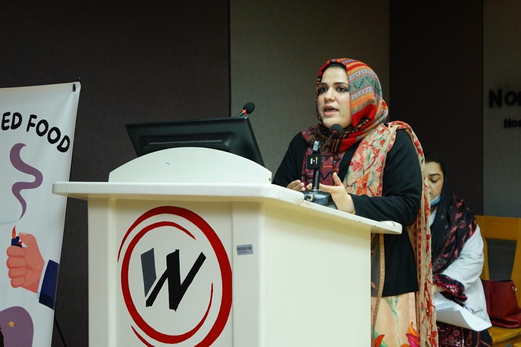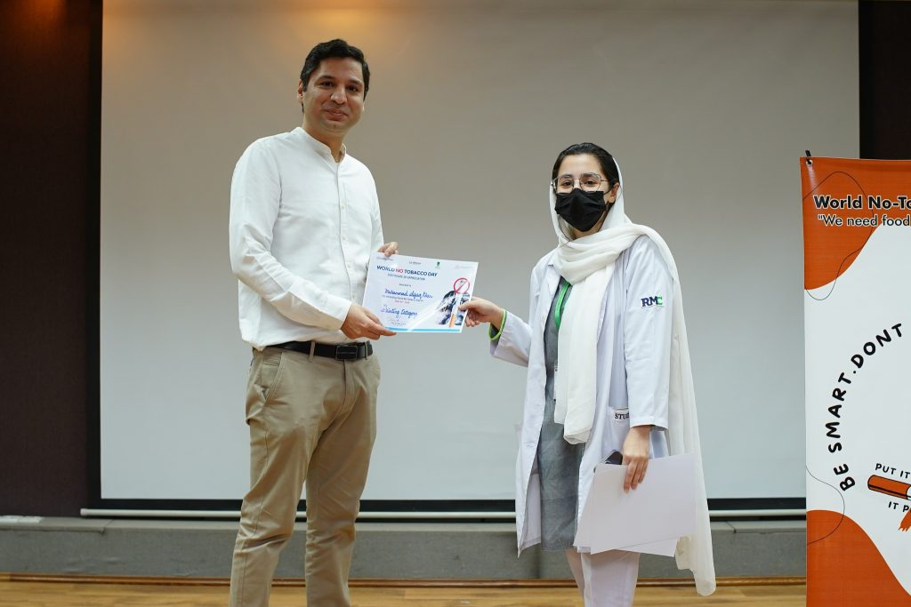 Ms. Syeda Zainab Naqvi, Assistant Commissioner addressed the audience and shared her views about a tobacco-free environment. She commended the efforts by NWSM and gave a brief overview of all the activities implemented by the government to bring an end to the use of tobacco and nicotine-related products. Then, Dr. Zia ur Rehman awarded certificates and shields to the winning participants from each content category followed by a vote of thanks where he stressed upon working closely with government institutions in developing strategies in close consultation with health professionals. The programme came to a close with a group photograph.