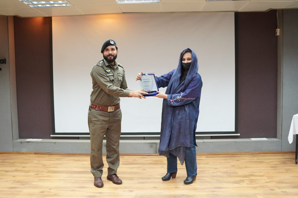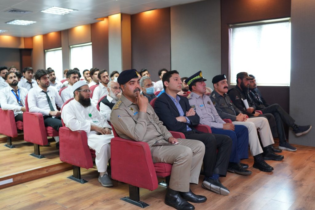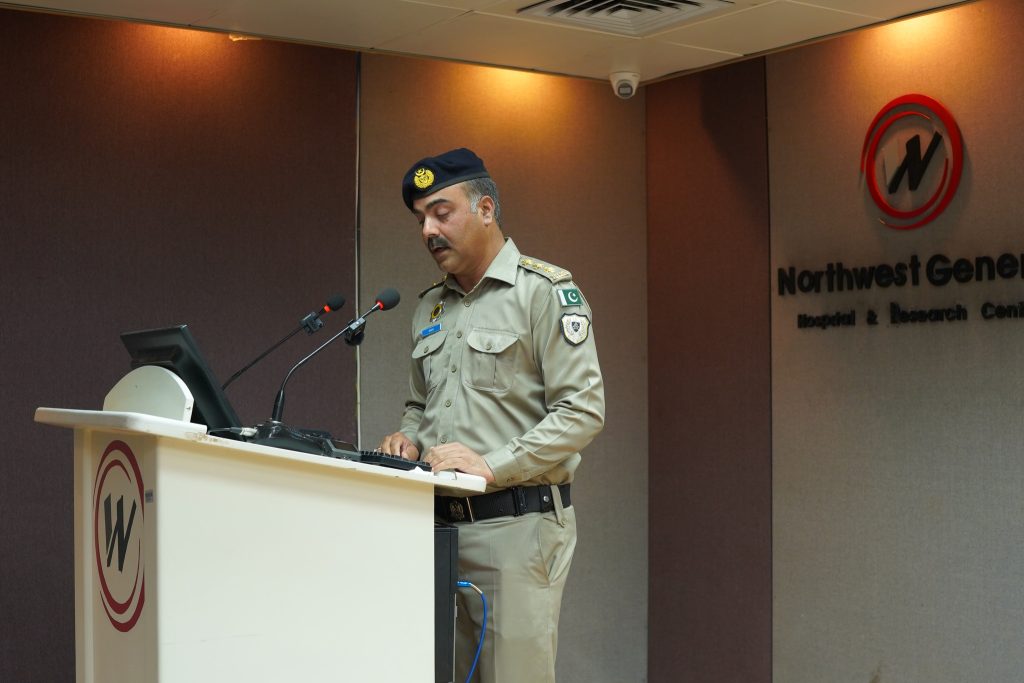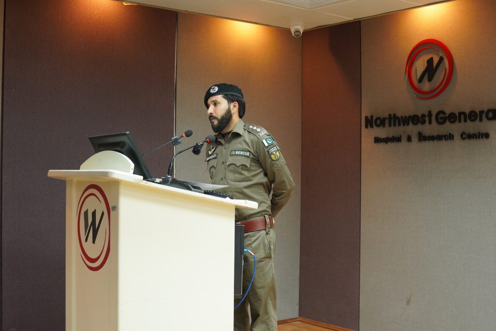 Mr. Ehsaan Marwat, DSP Education, City Traffic Police Peshawar graced the event as Chief Guest while Dr. Muhammad Tariq Barki, Consultant Neurosurgeon, NWGH moderated the event. The event was also attended by Mr. Basir Ilyas, Inspector/Senior Patrol Officer, M-1 Motorway, Mr. Saadat Ullah, Emergency Officer, Rescue 1122 and Mr. Asif Raza, Incharge Education, City Traffic Police Peshawar. The Chief Guest along with other esteemed guests also spoke at the event. Leaflets regarding awareness of and prevention against brain injury were distributed among the audience and the traffic police personnel to be further distributed among the general public.
