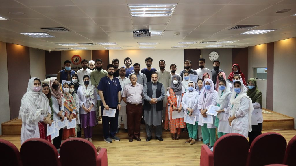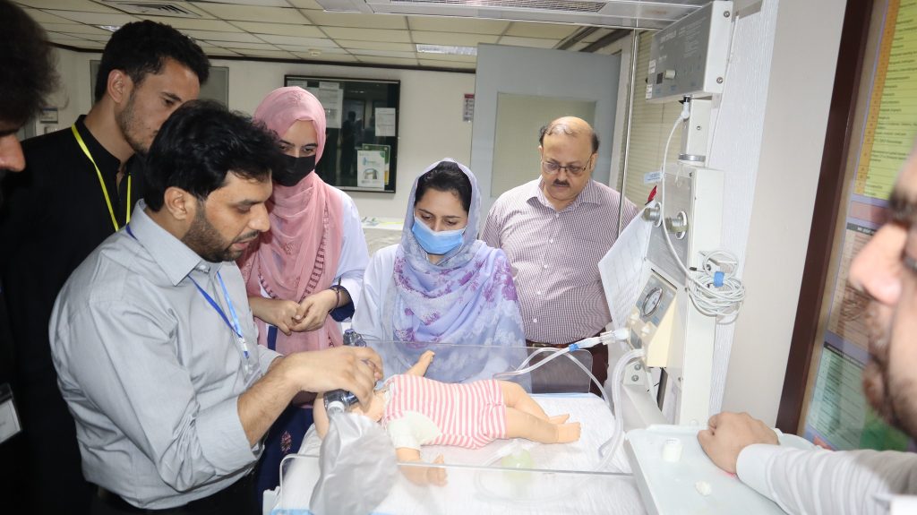 The Department of Neonatology, Northwest General Hospital successfully conducted the 8th Neonatal Resuscitation Workshop under the Northwest Neonatal Simulation Center on the 27th of May, 2023. The session was attended by Dr. Inamullah Khan, Health & Nutrition Officer UNICEF, Khyber Pakhtunkhwa. The workshop commenced with the recitation of the Holy Quran following the registrations of the participants. Dr. Bilal Ahmed Sethi, Consultant Neonatology and Paediatrician, NWGH gave a brief introduction about the course and the NRP lectures were followed by four hands-on stations each one dedicated towards the use of resuscitation devices, chest compression, endotracheal intubation, and medications demonstrations. Thereafter, simulation-based neonatal emergency scenarios were assigned to participants in groups of two, video recordings were made and then a debriefing was given based on the videos. Dr. Inamullah Khan distributed certificates among the participants and commended the workshop.